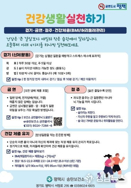 평택시 송탄보건소는 시민을 대상으로 걷기(신체활동)뿐만 아니라 금연·절주·건강 체중 유지로 구성된 '4가지 건강생활습관 실천’수칙을 적극 안내하고, 일상에서 작은 습관부터 실천해 건강을 지켜나갈 것을 당부했다.