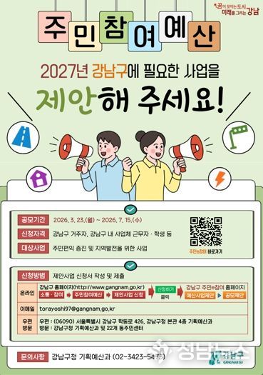 꿈이 모이는 도시, 미래를 그리는 강남구가 2027년도 예산편성에 반영할 주민참여예산 제안사업 공모를 3월 23일부터 7월 15일까지 진행한다. 올해 공모 규모는 총 13억 원으로, 주민이 직접 생활 속 불편을 해결하고 지역에 필요한 사업을 제안해 예산에 반영하는 참여형 제도다.