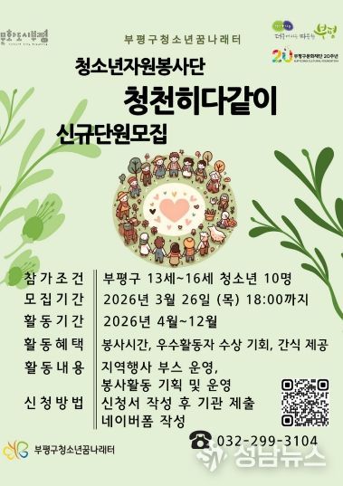 부평구청소년꿈나래터는 오는 26일까지 2026년도 청소년자원봉사단 ‘청천히 다같이’ 단원을 신규 모집한다고 밝혔다.