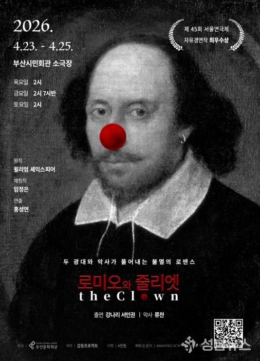 (재)부산문화회관(대표이사 차재근)은 오는 4월 23일부터 25일까지 3일간 부산시민회관 소극장에서 연극 '로미오와 줄리엣 The Clown〉을 선보인다. 이 작품은 2024년 제45회 서울연극제 자유경연작 최우수상 수상작으로 예술성과 완성도를 동시에 인정 받으며 관객과 평단의 호평을 받은 작품이다.