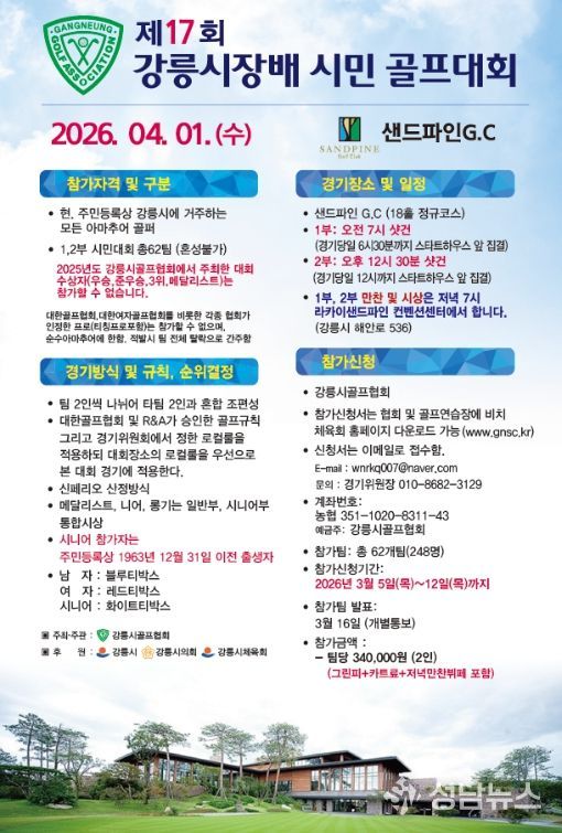 강릉시는 오는 4월 1일 시민 화합과 건강 증진을 위한 '제17회 강릉시장배 시민 골프대회'를 강릉 샌드파인GC에서 개최한다.