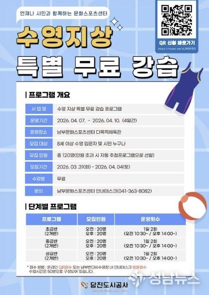 당진도시공사는 “이번 지상 무료 강습 프로그램을 통해 시민 들이 보다 안전하고 체계적으로 수영을 접할 수 있을 것으로 기대 한다”며 “앞으로도 시민 건강 증진과 생활 체육 활성화를 위한 공공서비스를 지속적으로 확대해 나가 겠다”고 밝혔다.