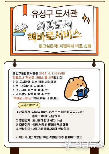 정용래 유성구청장은 “이번 서비스를 통해 책을 기다리는 시간을 줄이고 독서 접근성이 향상되길 바란다”라며 “앞으로도 지역 서점과 상생하는 독서 정책을 확대하겠다”라고 말했다.