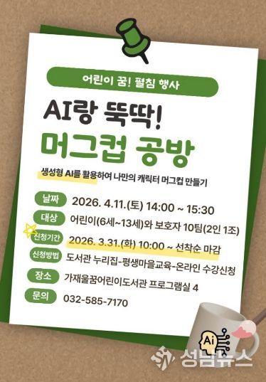 인천광역시교육청서구도서관은 오는 4월, 어린이를 동반한 가족이 참여하는 생성형 AI를 활용한 특별 프로그램 ‘AI랑 뚝딱! 머그컵 공방’을 운영한다.