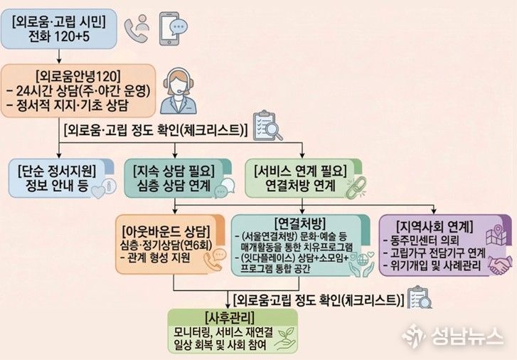 일상 공유, 감정 공감을 통한 정서적 지지를 기본으로 상담 서비스를 제공하며 나아가 대상자별 고립 특성과 욕구에 따라 필요한 정보 제공, 복지서비스 연계도 이뤄진다. 또 외로움·고립 고위험군은 대상자 동의를 얻어 상담사가 정기적으로 전화하는 ‘아웃바운드 상담’을 제공하고 있다.