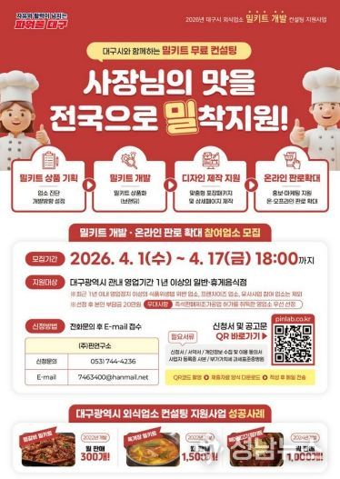 대구광역시는 지역 외식업소의 경쟁력을 높이고 온라인 시장 진출을 돕기 위한 ‘2026년 외식업소 밀키트 개발 컨설팅 지원사업’ 참여업소를 오는 4월 17일까지 모집한다.