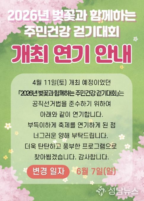 홍성군 광천읍과 광천읍주민자치회는 당초 11일 광천읍 하상주차장에서 개최할 예정이었던 ‘2026년 벚꽃과 함께하는 주민건강 걷기대회’ 행사를 6월 7일로 연기한다고 밝혔다.