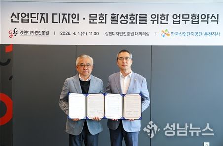 강원디자인진흥원은 1일 강원디자인진흥원 대회의실에서 한국산업단지공단 강원지역본부 춘천지사와 산업단지 내 디자인·문화 활성화를 위한 공동사업 추진 업무협약을 체결했다고 밝혔다.