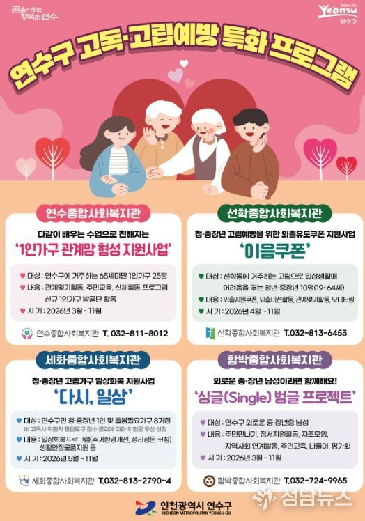 연수구가 사회적 고립 가구의 일상을 살피고 지역사회 복귀를 돕기 위해 지역 내 종합사회복지관 4곳과 함께 ‘2026년 고독·고립 예방 특화사업’을 본격적으로 추진한다.