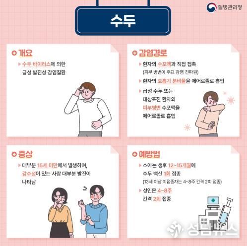 수두와 유행성이하선염은 환자가 기침할 때 나오는 침방울 등 호흡기 분비물을 통해 전파되는 대표적인 감염병이다.
