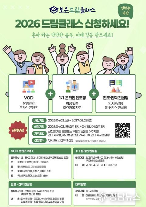 충북 보은군은 교육발전특구사업과 연계해 도농 간 교육 격차를 해소하고 지역인재를 양성하기 위한 ‘2026년 보은군 학습증진사업(보은 드림 클래스)’을 본격 추진한다고 3일 밝혔다.