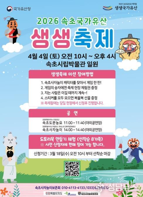 국가유산청 공모사업인 ‘2026년 생생국가유산 사업’의 하나로 마련된 ‘2026 속초국가유산 생생축제’가 오는 4월 4일(토) 속초시립박물관에 열린다.
