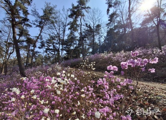 현재 산책로를 따라 만개한 진달래는 소나무의 짙은 녹음과 대비를 이루며 한 폭의 수채화 같은 풍경을 연출하고 있다.