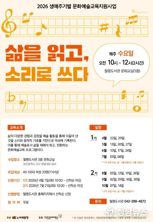 ‘삶을 읽고, 소리로 쓰다’는 이달 7일 오전 10시부터, ‘선율과 문장’은 21일 오전 10시부터 월평도서관 홈페이지에서 선착순으로 모집한다.
