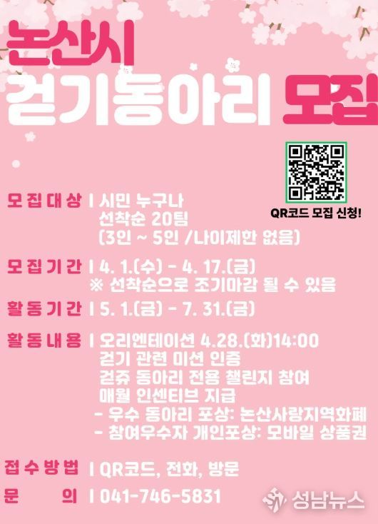 백성현 논산시장은 “걷기는 일상에서 가장 쉽게 실천할 수 있는 건강관리 방법”이라며 “이번 프로그램이 시민들의 자발적인 건강생활 실천을 확산시키는 계기가 되길 기대하며 앞으로도 다양한 정책을 통해 시민건강증진에 힘쓰겠다”라고 말했다.