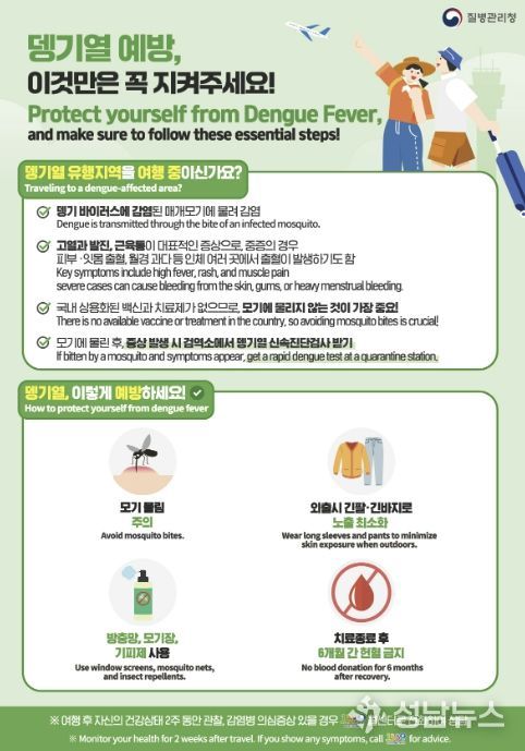 보건소는 해외 방문 후 2주 이내 뎅기열 의심 증상(발열, 두통, 발진 등)이 있는 경우 주소지와 관계없이 누구나 무료 확진 검사를 받을 수 있다고 설명했다.