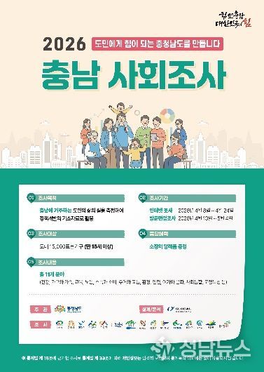 청양군이 군민의 삶의 질과 주관적 복지 수준을 파악해 향후 도정 및 군정 운영의 기초 자료로 활용하기 위한 ‘2026 충남사회조사’를 본격 실시한다.