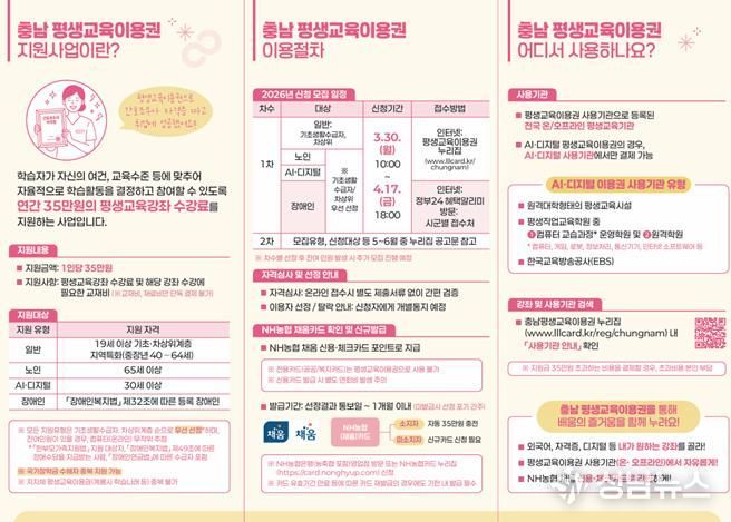 한편, 신청 및 카드발급 등 관련 문의는 충남 평생교육이용권 상담콜센터 또는 누리집 게시판을 통해 확인할 수 있다.