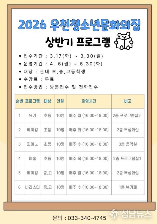우천청소년문화의집에서 우천 지역 청소년들을 위한 상반기 프로그램을 시작한다.
