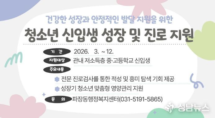 수원시 장안구 파장동은 진로탐색 기회가 부족한 저소득층 청소년을 위해 ‘청소년 신입생 성장·진로 지원사업’을 추진한다고 밝혔다.