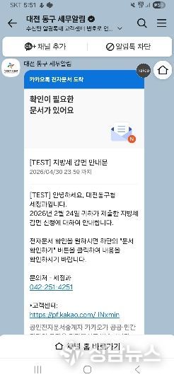 대전 동구는 이달부터 납세자 권익 보호를 위한 시책의 일환으로 ‘지방세 감면 유예기간 알림톡 서비스’를 본격 추진한다고 7일 밝혔다.