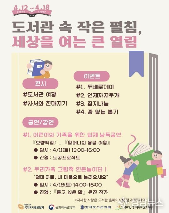 제천기적의도서관은 제62회 도서관주간을 기념해 오는 4월 11일부터 19일까지 어린이와 가족이 함께 즐길 수 있는 다채로운 독서문화 프로그램과 이벤트를 운영한다.