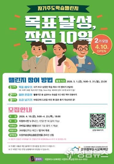 의정부도시교육재단은 시민의 일상 속 학습 실천을 응원하는 의정부시민대학 시민LAB 자기주도학습챌린지 ‘목표달성, 작심 10일’ 2기 참여자를 모집한다고 밝혔다.