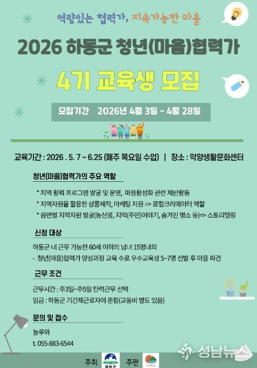 하동군은 지역 활력 회복과 청년 일자리 창출을 위해 추진 중인 ‘청년(마을)협력가 양성과정’의 제4기 교육생을 오는 4월 28일까지 모집한다고 밝혔다.