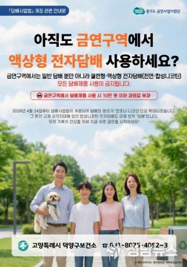 고양특례시 덕양구보건소는 개정된 '담배사업법' 시행에 따라 오는 24일부터 금연구역 내 담배제품 사용에 대한 지도·점검을 강화한다.