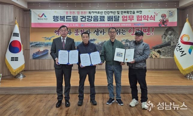 인지면지역사회보장협의체(공공위원장 박한일, 민간위원장 유병상)는 9일 지역특화사업인 '행복드림 건강음료 배달'사업 추진을 위해 건국우유 서해대리점(대표 김성태)과 업무협약을 실시했다.