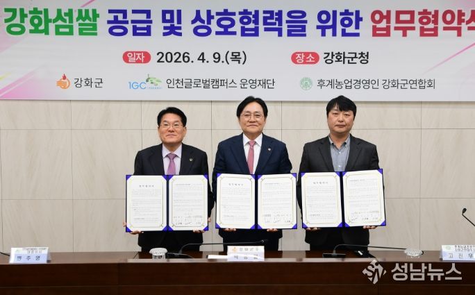 강화군은 9일, 인천글로벌캠퍼스운영재단(대표이사 변주영), (사)한국후계농업경영인 강화군연합회(회장 고진우)와 함께 ‘강화섬쌀 공급 및 상호 협력’을 위한 업무협약(MOU)을 체결했다고 밝혔다.