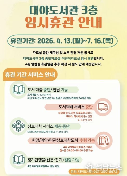 군포시 대야도서관은 노후된 자료실 환경을 개선하고 이용자 중심의 효율적인 공간 재구성을 위해 오는 4월 13일부터 7월 16일까지 리모델링 공사를 실시하고, 해당 기간동안 3층 자료실을 임시휴관한다고 밝혔다.