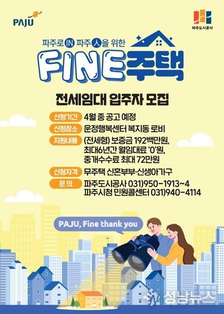 파주시가 신혼부부와 신생아 가구의 주거비 부담 완화를 위해 파주형 기본주택 ‘파인(FINE)주택’전세임대사업을 본격 추진한다.