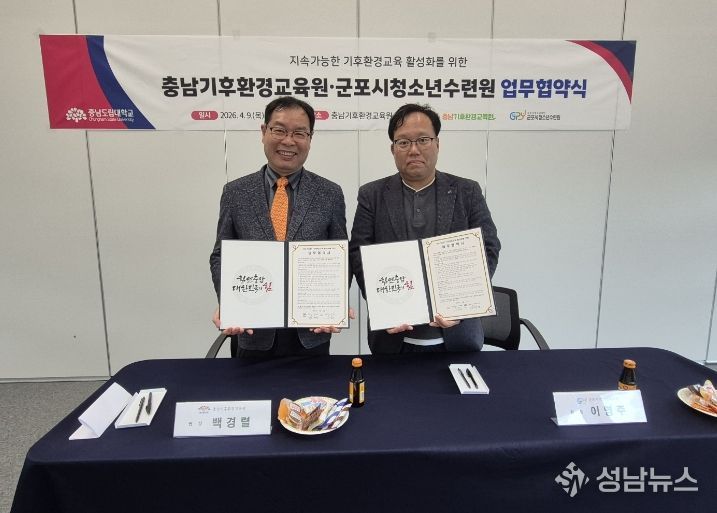 충남도립대학교 부속기관인 충남기후환경교육원은 군포시청소년수련원과 ‘지속가능한 기후환경교육 활성화’를 위한 업무협약(MOU)을 체결했다고 밝혔다.