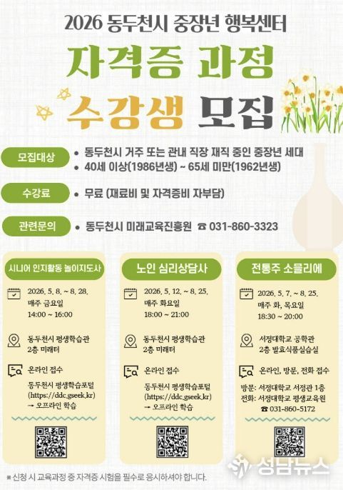동두천시 미래교육진흥원은 지역 내 중장년층의 성공적인 인생 2막과 안정적인 사회 참여를 지원하기 위해 ‘2026년 중장년 행복센터 자격증 과정’ 수강생을 모집한다고 밝혔다.