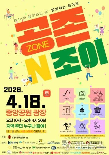 부천시장애인종합복지관은 오는 4월 18일 중앙공원 광장에서 제46회 장애인의 날 기념행사 ‘공존N조이’를 개최한다. 이번 행사는 장애인과 지역 주민이 다양한 체험과 참여 프로그램을 통해 자연스럽게 어울리며 공존의 가치를 공유하는 지역문화 축제로 기획됐다.
