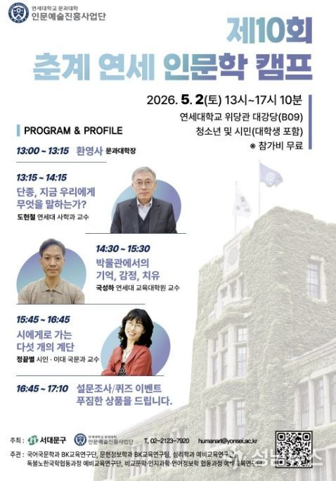 서대문구가 연세대학교 문과대학과 공동으로 5월 2일 오후 1시부터 5시 10분까지 연세대 위당관 대강당(B09호)에서 ‘제10회 연세 인문학 캠프’를 개최한다.