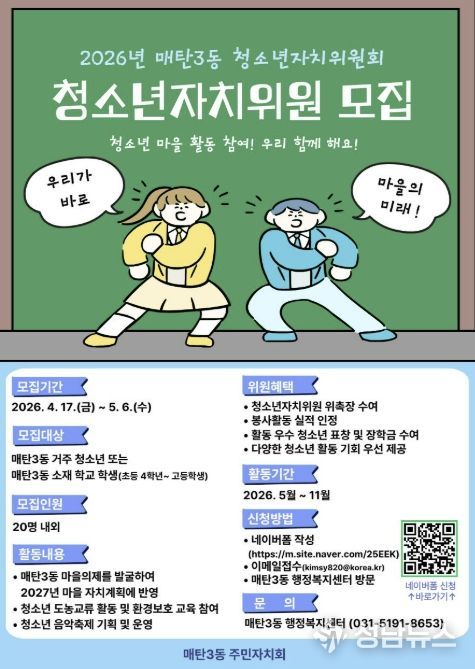 수원시 영통구 매탄3동은 매탄3동 주민자치회가 지역 청소년의 참여를 확대하고, 향후 지역사회를 이끌어 나갈 역량을 기르기 위해 2026년 청소년자치위원회 위원을 모집한다고 밝혔다.