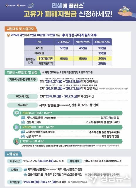 군 관계자는 “가평군은 인구감소 우대 지역으로 분류돼 지원 규모가 큰 만큼, 대상 군민들이 한 분도 빠짐없이 혜택을 받을 수 있도록 신청 안내와 현장 대응에 만전을 기하겠다”고 말했다.