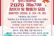 (성남뉴스) 원주시 평생교육원 학습관은 오는 11월 말까지 2026년 원주시 평생학습 재능기부 참여자 및 활동처를 수시 모집한다. 재능기부 참여자는 평생교육 강사, 학습동아리 등 자신의 재능을 무보수로 나눠주고 싶은 개인 또는 팀이다. 재능기부 활동처는 프로그램 참여를 희망하는 관내 경로당과 요양원, 복지관 등 관람 인원이 15명 이상인 곳이다. 학습관은 오는 4월부터 11월까지 매달 희망 활동처 2곳과 재능기부 팀 1∼3곳을 연계해 프로그램을 운영할 계획이다. 모집 기간은 2월 23일부터 11월 30일까지다. 학습관 또는 원주시 통합예약플랫폼 홈페이지에서 서식을 내려받아 작성한 후, 이메일 제출하면 신청할 수 있다. 자세한 사항은 학습관 평생교육팀으로 문의하면 된다. 윤석재 학습관장은 “평생학습으로 배운 재능을 지역의 소외계층과 함께 나눔으로써 재능기부 문화를 활성화할 수 있도록 많은 관심과 참여를 부탁드린다”라고 말했다.