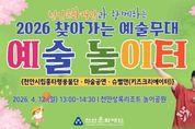 천안문화재단은 오는 12일 천안상록리조트 놀이공원 일원에서 ‘예술놀이터’를 운영한다고 7일 밝혔다. 재단은 시민들이 일상 가까이에서 문화예술을 접할 수 있도록 다양한 생활권 공간을 찾아가 공연과 체험 프로그램을 제공하는 ‘찾아가는 예술무대’를 추진하고 있다. 예술놀이터는 찾아가는 예술무대 사업 중 하나로, 어린이와 가족 단위 방문객에게 전통예술과 퍼포먼스, 참여형 프로그램을 제공한다. 천안시립흥타령풍물단의 전통 풍물 공연을 시작으로, 마술사 최준형의 버스킹 마술쇼, 어린이 인기 크리에이터 ‘슈뻘맨’의 참여형 무대가 이어질 예정이다. 행사는 별도의 사전예약 없이 자유롭게 참여하면 된다. 안동순 대표이사는 “어린이와 가족이 함께 참여할 수 있도록 프로그램을 마련했다”며 “앞으로도 시민이 일상에서 문화예술을 접할 수 있는 기회를 확대해 나갈 것”이라고 말했다.