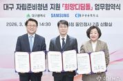 (성남뉴스) 대구광역시는 삼성전자, 대구상공회의소와 함께 3월 16일 시청 동인청사 상황실에서 자립준비청년의 안정적인 사회 정착과 취업지원 강화를 위한 ‘희망디딤돌 업무협약(MOU)’을 체결했다. 이날 협약식에는 김정기 대구광역시장 권한대행을 비롯해 박승희 삼성전자 사장, 정효명 부사장, 하헌재 상무, 이경민 삼성생명 고문 등 주요 임원진과 박윤경 대구상공회의소 회장 등이 참석했다. 협약에 따라 대구시와 삼성전자는 지난 2016년 삼성전자의 사회공헌사업으로 설치된 ‘대구자립통합지원센터’의 시설 인프라 개선을 추진한다. 이를 통해 매년 센터를 이용하는 100여 명의 보호아동과 자립준비청년들에게 보다 쾌적하고 안전한 주거환경을 제공할 계획이다. 단순 주거지원을 넘어 청년들의 경제적 자립을 돕는 취업 지원 프로그램도 강화된다. 삼성전자는 ‘전자IT 제조기술자’ 및 ‘반도체 정밀배관 기술자’ 양성과정 등 전문적인 취업설계교육을 지원해, 청년들이 기술 역량을 쌓아 경제적으로 독립할 수 있는 기반을 마련한다. 더불어 대구상공회의소는 지역 우수기업을 발굴해 직무교육을 이수한 자립준비