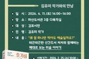 (성남뉴스) 김포시 마산도서관은 오는 4월 11일 오후 2시부터 4시까지 ‘토요시독회’ '호기심 미술책방'을 운영한다. ‘토요시독회’는 최근 출간된 신간도서를 중심으로 저자와 시민이 만나 책의 내용을 깊이 있게 나누는 독서문화 프로그램이다. 이번 강의는 '호기심 미술책방'의 저자 김유미 작가가 진행한다. 미술교육을 전공하고 현직 교사로 재직 중인 김유미 작가는 다양한 교육 현장에서의 경험을 바탕으로 시민들과 미술에 대한 이야기를 나눌 예정이다. 강연은 ‘드로잉으로 여는 미술 인문학’을 주제로 진행된다. 컨투어 드로잉과 현대미술 사례를 통해 예술을 새롭게 바라보는 시각을 나누고, 일상에서 미술을 보다 쉽게 감상할 수 있는 방법을 소개한다. 강의 신청은 2월 25일 수요일 오전 10시부터 김포시 통합예약 홈페이지 또는 방문 접수를 통해 가능하며, 김포시민 50명을 선착순으로 모집한다.