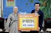 보령시는 27일 시장실에서 김동일 보령시장과 삽시도 금송사 죽림선원 진관스님 등 관계자가 참석한 가운데 이웃사랑 후원물품 전달식을 가졌다고 밝혔다. 이날 기탁된 물품은 230만 원 상당의 라면 108박스로, 식사 준비에 어려움을 겪는 관내 저소득 취약계층 가구의 생활 안정을 돕기 위해 마련됐다. 기탁된 물품은 각 읍·면·동을 통해 도움이 필요한 소외계층 108가구에 소중히 전달될 예정이며, 대상자들이 일상 속에서 따뜻한 이웃의 정을 느낄 수 있도록 도울 계획이다. 삽시도 금송사 죽림선원은 지난 18여 년 동안 여름철 냉방기기, 겨울철 이불 등 계절마다 꼭 필요한 맞춤형 물품을 후원하며 보령시 나눔 문화 확산의 본보기가 되고 있다. 진관스님은 “정성을 담아 준비한 물품이 우리 주변의 어려운 이웃들에게 작게나마 실질적인 도움이 되길 바란다”며 “앞으로도 이웃과 함께 상생하며 부처님의 나눔 정신을 실천해 나가겠다”고 말했다. 김동일 보령시장은 “매번 계절마다 꼭 필요한 물품으로 온정을 전해주시는 금송사 죽림선원 진관스님께 깊이 감사드린다”며 “기탁하신 소중한 성품이 꼭 필요한 분들께 잘 전달