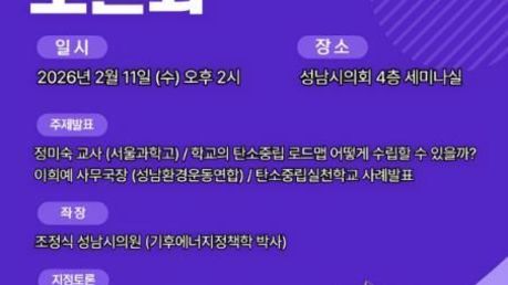 (성남뉴스) 기후위기 대응과 학교 현장의 탄소중립 실천 방안을 논의하기 위한 '기후위기 시대 학교 탄소중립 토론회'가 오는 2026년 2월 11일 오후 2시, 성남시의회 4층 세미나실에서 열린다. 이번 토론회에서는 학교 탄소중립 로드맵 수립 방안과 학교 현장의 탄소중립 실천 사례를 중심으로 주제 발표와 지정토론이 진행될 예정이다. 주제발표는 정미숙 교사(서울과학고)가 ‘학교의 탄소중립 로드맵을 어떻게 수립할 수 있는가’를 주제로 발표하며, 이희애 사무국장(성남환경운동연합)이 ‘탄소중립 실천학교 사례’를 소개한다. 좌장은 조정식 성남시의원(기후에너지정책학 박사)이 맡는다. 지정토론에는 박은주 성남지회장(참교육을 위한 전국학부모회), 박선경 이사장(한살림 성남용인), 배채영 연구위원(성남시정연구원), 이명주 교수(명지대), 한미숙 대표(주식회사 해리트)가 참여해 학교와 지역사회의 역할, 정책·연구·현장 적용 방안 등을 중심으로 의견을 나눌 예정이다. 본 토론회는 기후위기 대응과 학교 탄소중립과 관련한 제도·사례·과제를 공유하기 위한 공개 토론의 장으로 마련된다.