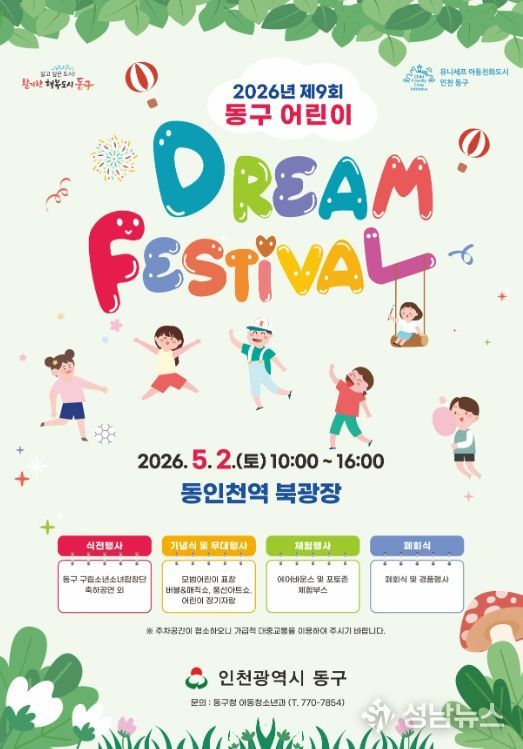 인천 동구는 오는 2일 동인천역 북광장에서 제104회 어린이날을 맞아‘2026년 제9회 동구 어린이 Dream Festival’을 개최한다고 밝혔다.