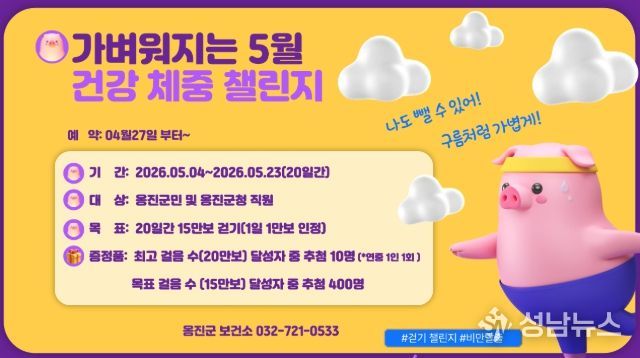 옹진군은 군민의 일상 속 걷기 실천을 유도하고 비만 예방 및 건강체중 관리를 지원하기 위해 5월 4일부터 23일까지 20일간 '가벼워지는 5월, 건강체중'챌린지 참가자를 4월 27일부터 모집한다고 밝혔다.