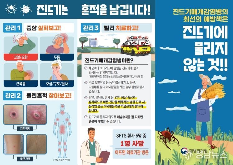 질병관리청은 진드기 매개 감염병인 중증열성혈소판감소증(SFTS) 환자가 4월 23일(목) 울산광역시에서 올해 처음 발생했다고 밝혔다. 첫 환자는 농작업을 하던 70대 남성으로, 현재 입원 치료 중이다. 특히, 경상북도는 2025년 SFTS 환자 수 45명으로 전국 1위를 기록하여 김천시 주민들의 각별한 주의가 요구된다.