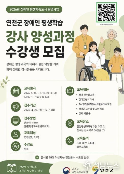 연천군은 교육부 국립특수교육원이 주관하는 '2026년 장애인 평생학습도시 운영 지원사업' 공모에 선정됨에 따라 장애인 평생교육 현장형 강사 양성 과정을 운영한다.