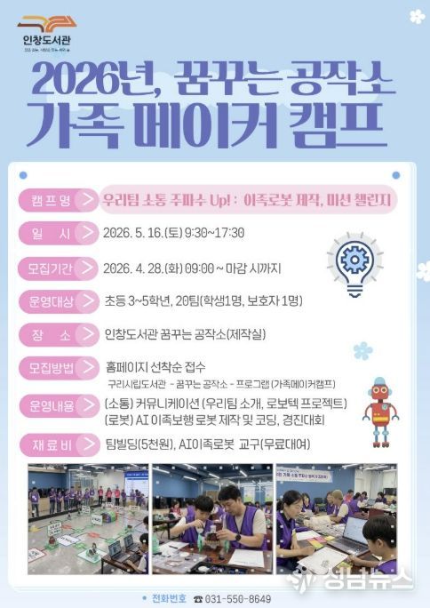 구리시 인창도서관‘꿈꾸는 공작소’는 오는 5월 16일 초등학생 자녀와 보호자가 함께 참여해 가족 간 유대감을 높이고 인공지능을 체험하는 '우리 팀 소통 주파수 Up! : 이족로봇 제작, 미션 챌린지' 가족 메이커 캠프를 운영한다고 밝혔다.